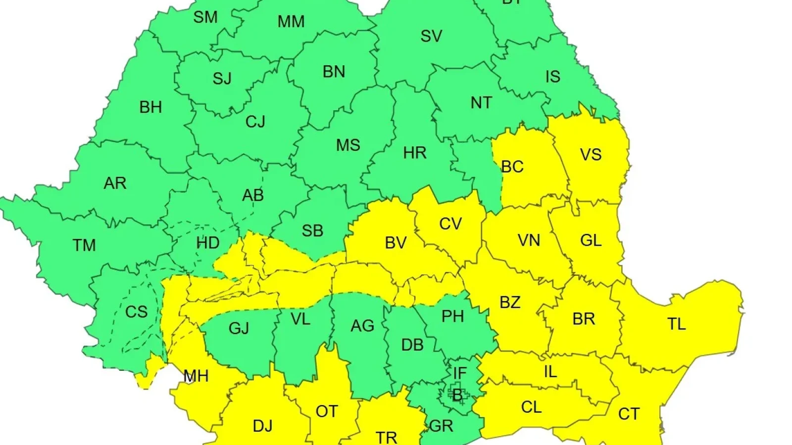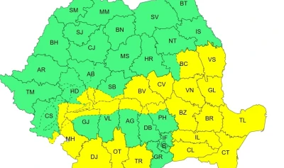During the same period, a second Yellow Code warning for strengthening winds, blizzard conditions and fresh snow cover will be in force in the Southern and Curvature Carpathians, where wind gusts will reach 70 - 90 km/h. Blizzard conditions will occur, visibility will drop below 100 metres and snow cover averaging 10 - 20 cm will accumulate, equivalent to 15 - 25 litres per square metre of water.