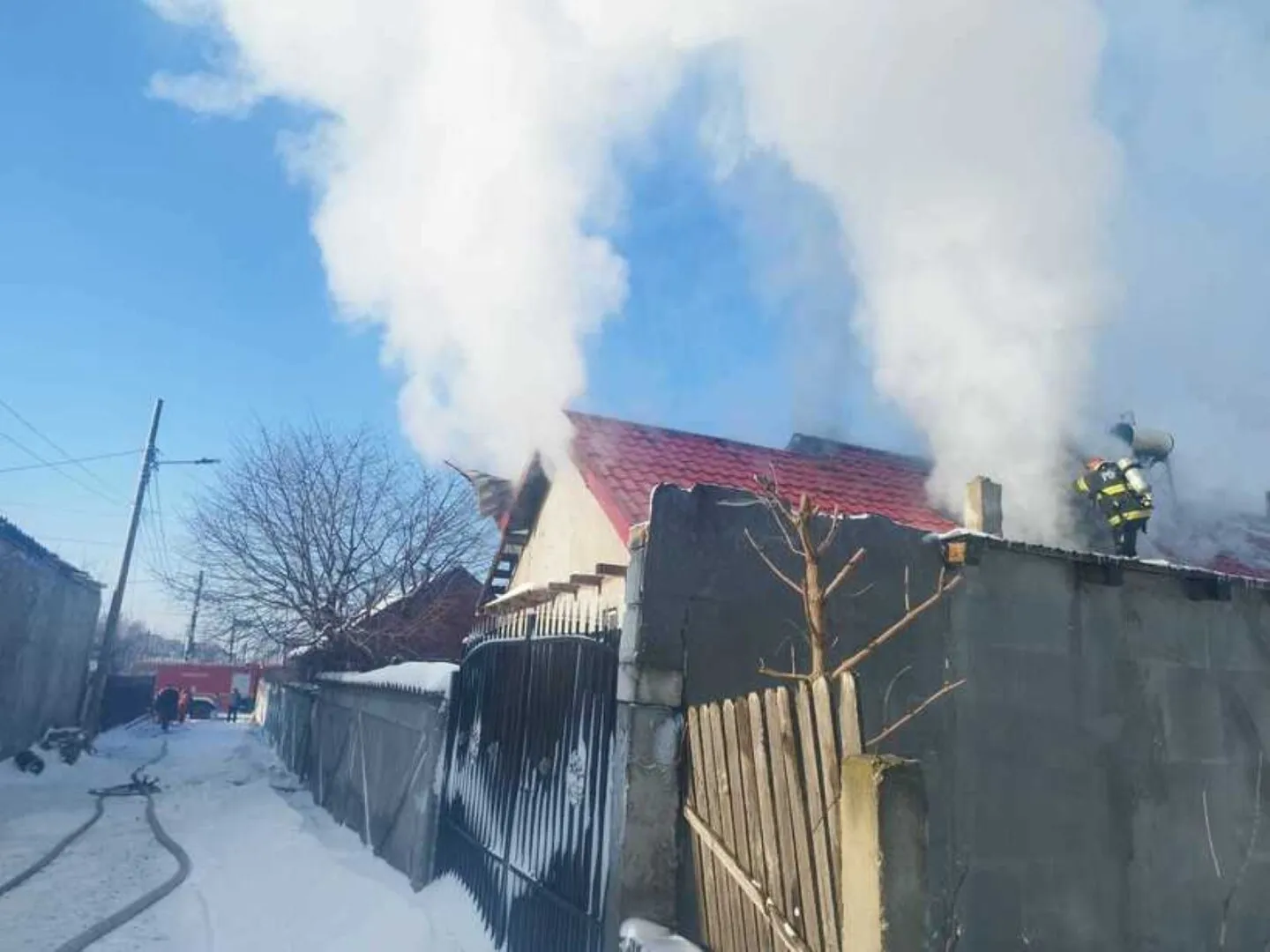 Casa arde generalizat pe o suprafaţă de 200 de metri pătraţi.
