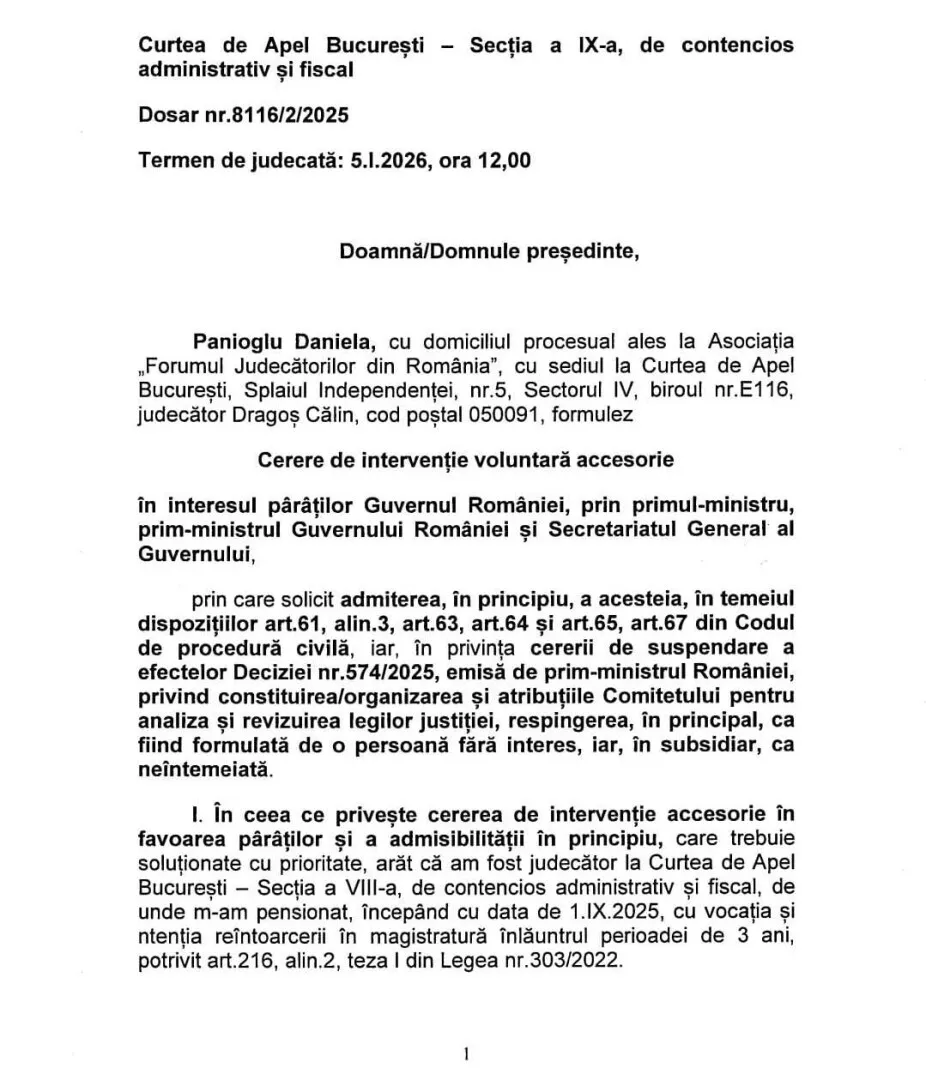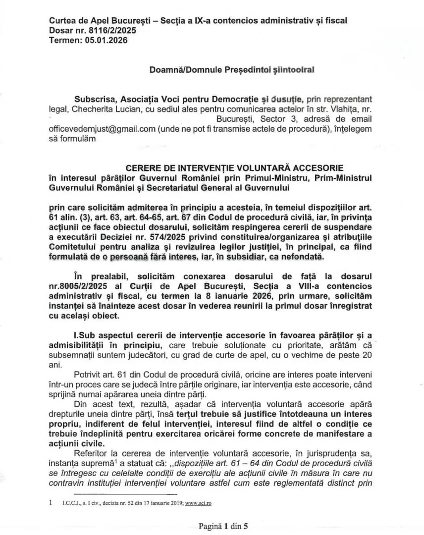 La Curtea de Apel București, procesul în care avocata Silvia Uscov contestă înființarea Comitetului pentru analiza și revizuirea legislației din domeniul justiției a primit un ingredient suplimentar controversat: trei cereri de intervenție voluntară accesorie în interesul Guvernului României. Nu sunt intervenții neutre, ci alinieri procesuale explicite cu Executivul.