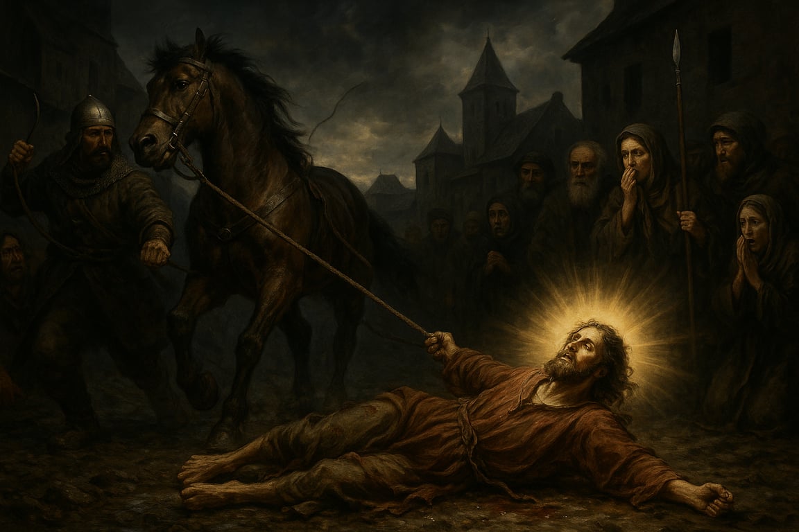 - A fost legat de coada unui cal și târât pe străzile cetății.