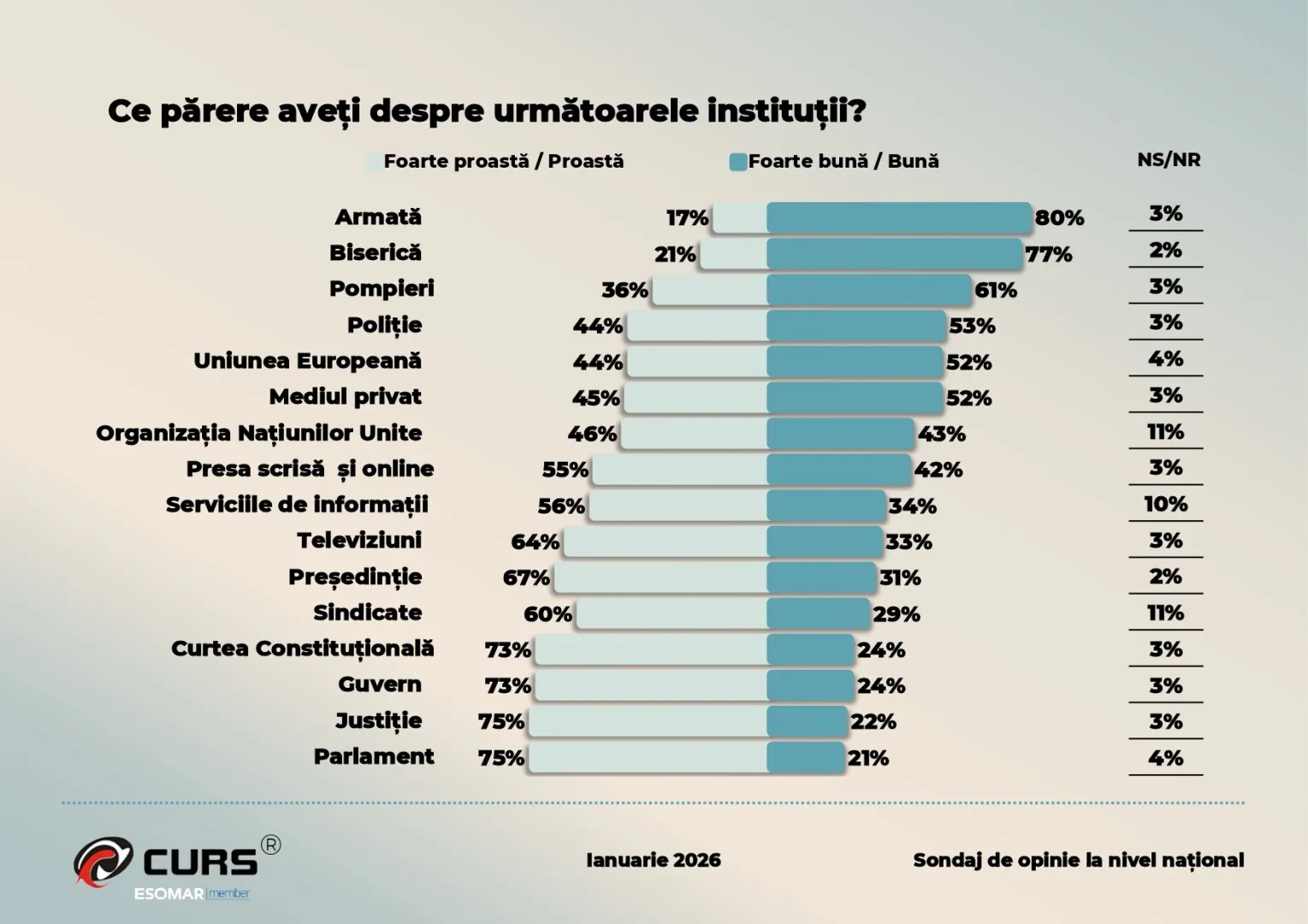 Evaluarea imaginii instituțiilor publice conturează o polarizare clară între structurile percepute drept stabile și cele asociate direct cu decizia politică. Armata, Biserica și Pompierii se bucură de cea mai bună imagine publică, cu niveluri de încredere situate între 61% și 80%, confirmând statutul lor de repere de stabilitate în percepția colectivă.
