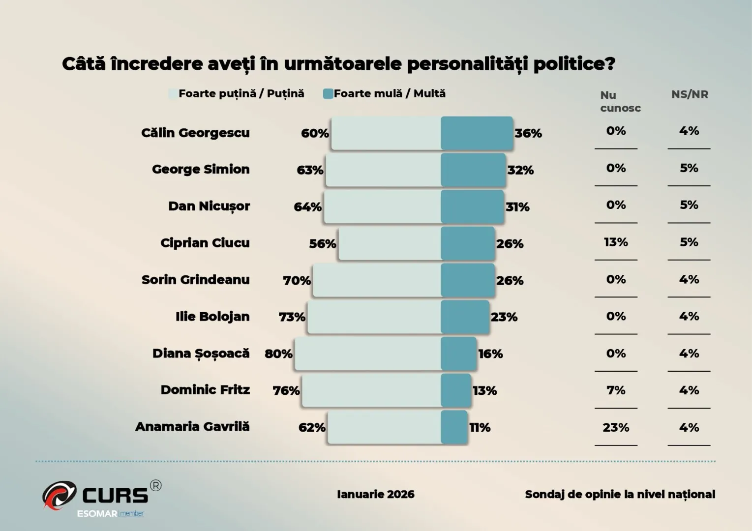 Nivelul de încredere al populației în principalele personalități politice rămâne scăzut, fără ca vreun lider să reușească să depășească pragul unei susțineri majoritare, arată un sondaj de opinie realizat de Centrul de Sociologie Urbană și Regională – CURS în luna ianuarie 2026.